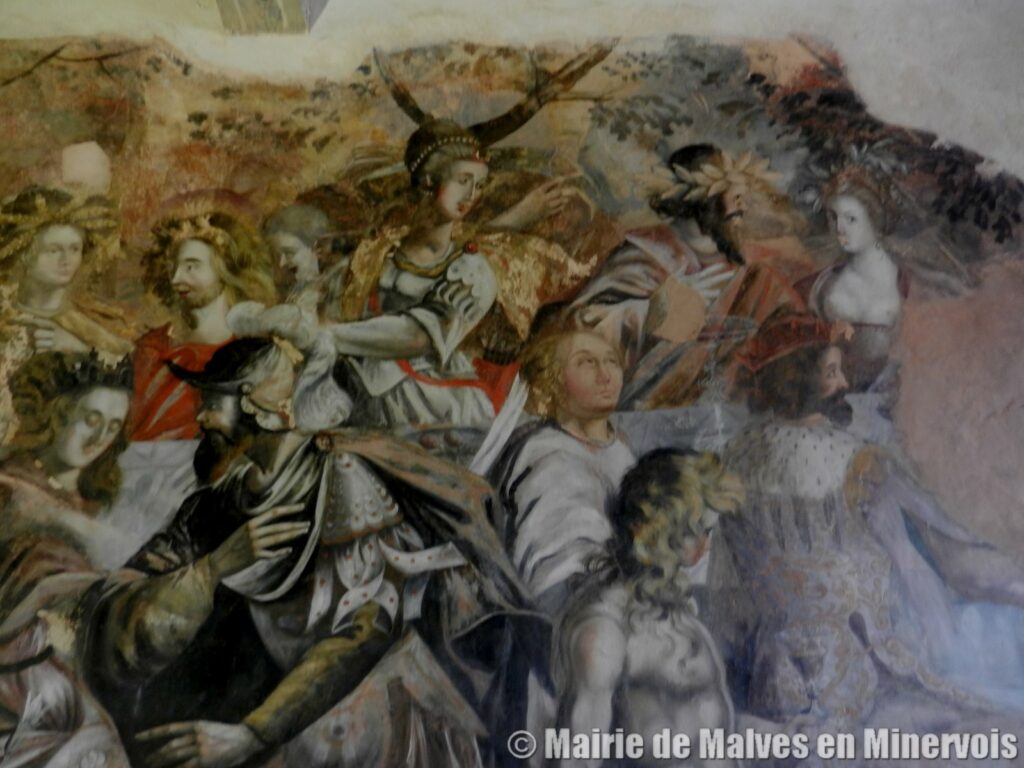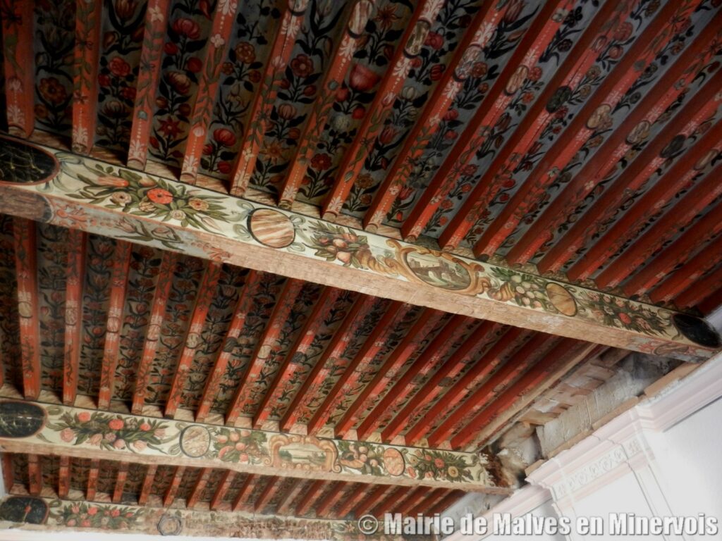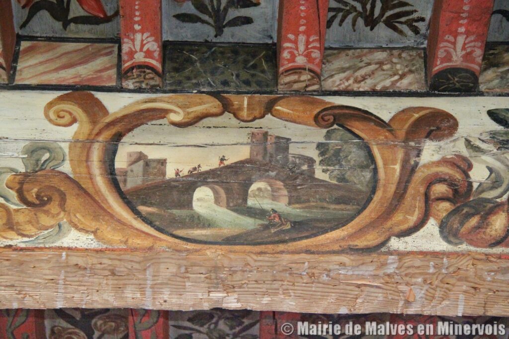 Situées sous les combles, ces œuvres décorent une pièce aux dimensions modestes. Le plafond est orné de vases fleuris, d’oiseaux et de motifs végétaux, inspirés de la célèbre galerie d’Ulysse à Fontainebleau. Les poutres présentent également des décors peints, où l’on distingue notamment le blason de la famille de Bellissen.